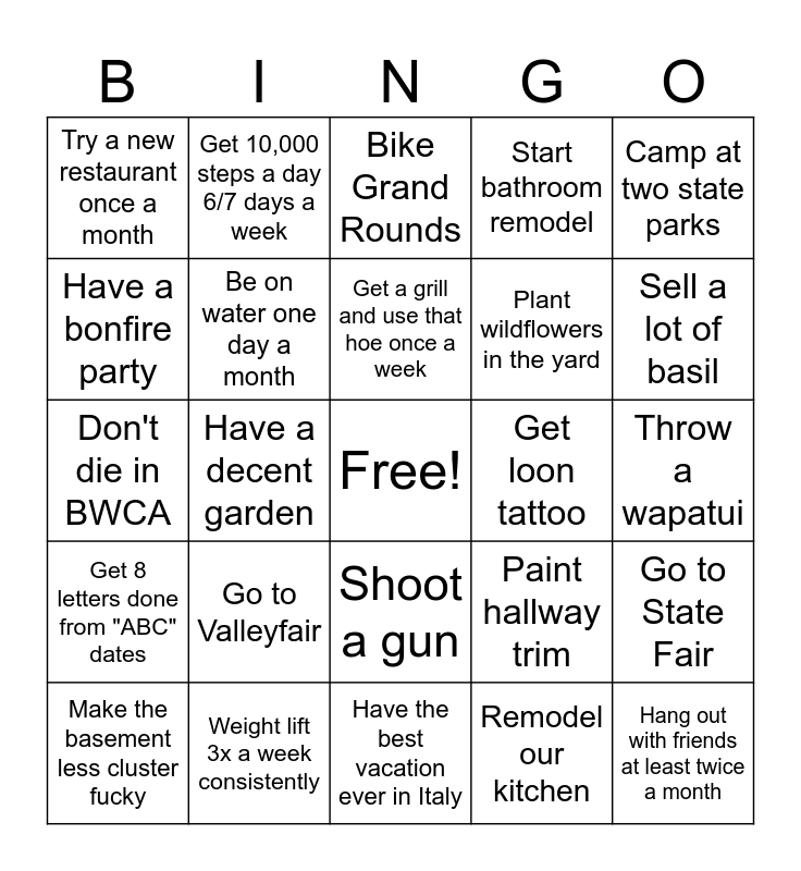 This bingo card has a free space and 24 words: Go to Valleyfair, Weight lift 3x a week consistently, Get a grill and use that hoe once a week, Make the basement less cluster fucky, Camp at two state parks, Try a new restaurant once a month, Have a bonfire party, Get 10,000 steps a day 6/7 days a week, Get loon tattoo, Shoot a gun, Plant wildflowers in the yard, Don't die in BWCA, Paint hallway trim, Go to State Fair, Be on water one day a month, Remodel our kitchen, Throw a wapatui, Bike Grand Rounds, Sell a lot of basil, Have a decent garden, Hang out with friends at least twice a month, Get 8 letters done from "ABC" dates, Start bathroom remodel and Have the best vacation ever in Italy.