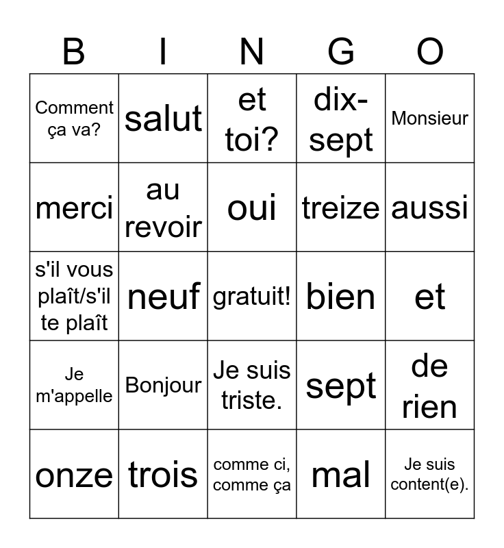 This bingo card has a free space and 24 words: Bonjour, trois, oui, onze, Monsieur, Comment ça va?, merci, salut, bien, Je suis triste., treize, s'il vous plaît/s'il te plaît, sept, de rien, au revoir, mal, et, et toi?, aussi, neuf, Je suis content(e)., Je m'appelle, dix-sept and comme ci, comme ça.