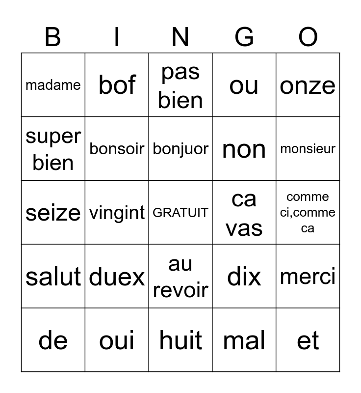 This bingo card has a free space and 24 words: duex, oui, bonjuor, de, onze, madame, super bien, bof, ca vas, au revoir, non, seize, dix, merci, bonsoir, mal, comme ci,comme ca, pas bien, monsieur, vingint, et, salut, ou and huit.