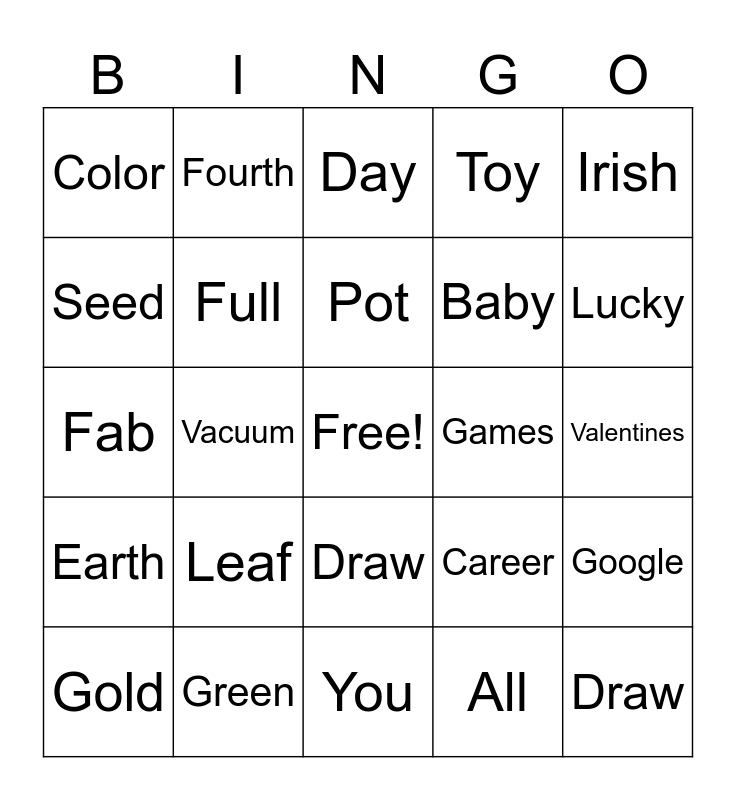 This bingo card has a free space and 24 words: Leaf, Green, Pot, Gold, Irish, Color, Seed, Fourth, Games, Draw, Baby, Fab, Career, Google, Full, All, Valentines, Day, Lucky, Vacuum, Draw, Earth, Toy and You.