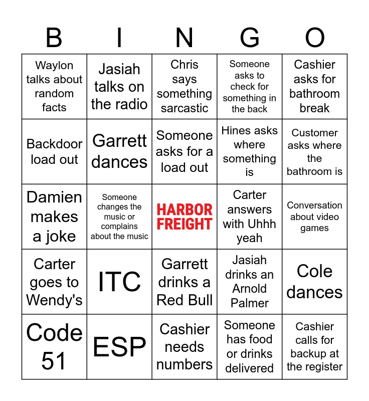 This bingo card has a free space and 24 words: ITC, ESP, Someone asks for a load out, Code 51, Cashier asks for bathroom break, Waylon talks about random facts, Backdoor load out, Jasiah talks on the radio, Carter answers with Uhhh yeah, Garrett drinks a Red Bull, Hines asks where something is, Damien makes a joke, Jasiah drinks an Arnold Palmer, Cole dances, Garrett dances, Someone has food or drinks delivered, Conversation about video games, Chris says something sarcastic, Customer asks where the bathroom is, Someone changes the music or complains about the music, Cashier calls for backup at the register, Carter goes to Wendy's, Someone asks to check for something in the back and Cashier needs numbers.