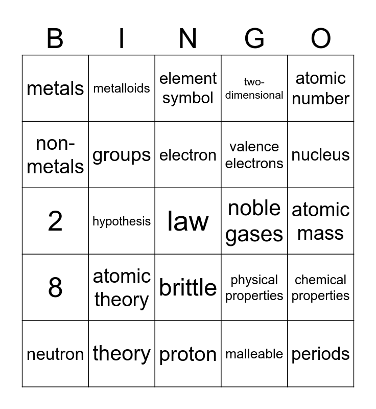 This bingo card has 25 words: atomic theory, proton, electron, neutron, atomic number, metals, non-metals, metalloids, noble gases, brittle, valence electrons, 2, physical properties, chemical properties, groups, periods, atomic mass, element symbol, nucleus, hypothesis, law, theory, 8, two-dimensional and malleable.