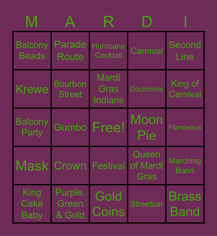 This bingo card has a free space and 62 words: Beads, Purple, Green & Gold, King Cake, Mask, Parade Float, Throw Me Something, Mister, Bourbon Street, French Quarter, Doubloons, Jester, Carnival, Fat Tuesday, Krewe, Zulu Coconut, Rex, Balcony Beads, Brass Band, Second Line, Feathered Mask, Mardi Gras Indians, Moon Pie, Hurricane Cocktail, King Cake Baby, Streetcar, Fleur-de-lis, Laissez les bons temps rouler, Masquerade Ball, Bead Toss, Marching Band, Confetti, Party on Bourbon, Costume Contest, Grand Marshal, Jazz Music, Flambeaux, Parade Route, Float Riders, Crawfish Boil, Gumbo, Zydeco, Balcony Party, Mardi Gras Ball, Crown, Royal Scepter, King of Carnival, Queen of Mardi Gras, Tinsel, Party Beads, Street Party, Masked Revelers, Festival, Gold Coins, Bead Catcher, Carnival Colors, Party Float, Revelry, Mardi Gras Parade, Jazz Funeral, Bead Necklace, Carnival King 👑, Mobile, Alabama and Jambalaya.