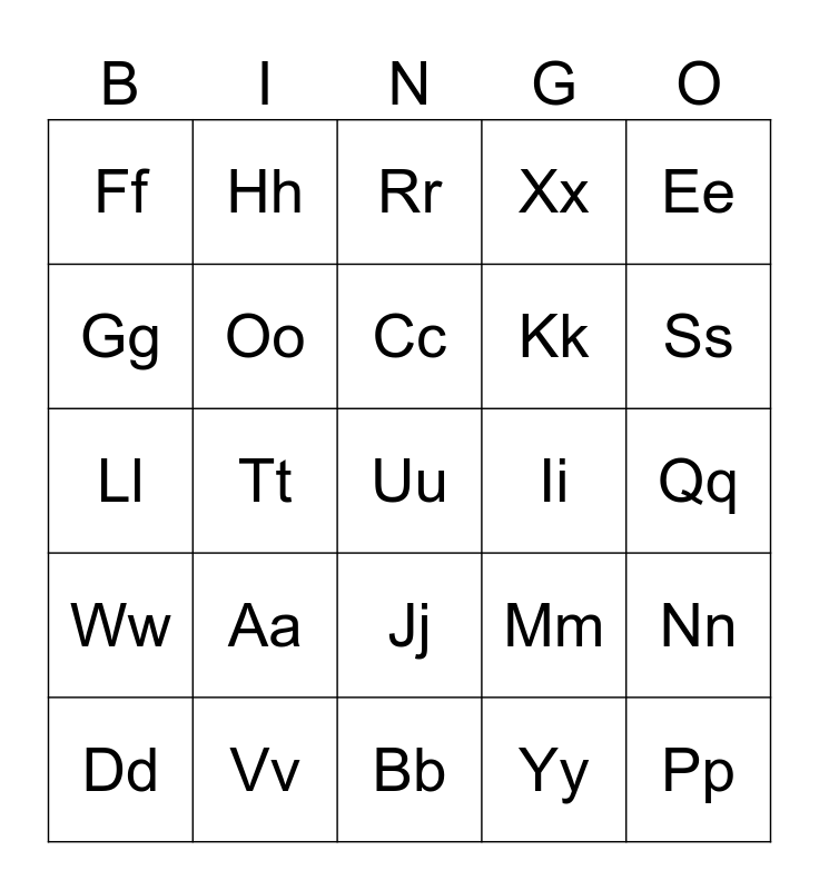 This bingo card has 25 words: Aa, Bb, Cc, Dd, Ee, Ff, Gg, Hh, Ii, Jj, Kk, Ll, Mm, Nn, Oo, Pp, Qq, Rr, Ss, Tt, Uu, Vv, Ww, Xx and Yy.