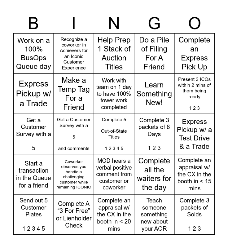 This bingo card has 25 words: Coworker observes you handle a challenging customer while remaining ICONIC, Complete an appraisal w/ the CX in the booth in < 20 mins, Work with team on 1 day to have 100% tower work completed, Send out 5 Customer Plates 1 2 3 4 5, Complete an Express Pick Up, Work on a 100% BusOps Queue day, Express Pickup w/ a Trade, Recognize a coworker in Achievers for an Iconic Customer Experience, Complete 3 packets of 8 Days 1 2 3, MOD hears a verbal positive comment from customer or coworker, Learn Something New!, Get a Customer Survey with a 5, Complete all the waiters for the day, Complete an appraisal w/ the CX in the booth in < 15 mins, Make a Temp Tag For a Friend, Complete 3 packets of Solds 1 2 3, Express Pickup w/ a Test Drive & a Trade, Help Prep 1 Stack of Auction Titles, Present 3 ICOs within 2 mins of them being ready 1 2 3, Get a Customer Survey with a 5 and comments, Complete 5 Out-of-State Titles 1 2 3 4 5, Complete A “3 For Free” or Lienholder Check, Start a transaction in the Queue for a friend, Do a Pile of Filing For A Friend and Teach someone something new about your AOR.
