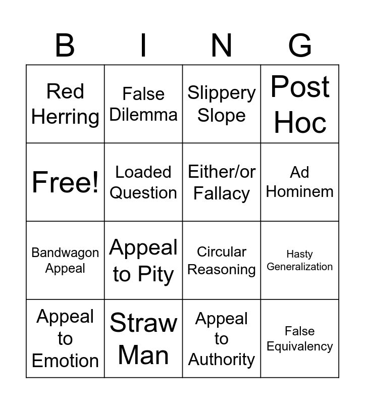 This bingo card has 16 words: Straw Man, Hasty Generalization, Slippery Slope, Red Herring, Bandwagon Appeal, False Dilemma, Circular Reasoning, Appeal to Authority, Free!, Loaded Question, Appeal to Emotion, Post Hoc, Appeal to Pity, Ad Hominem, Either/or Fallacy and False Equivalency.