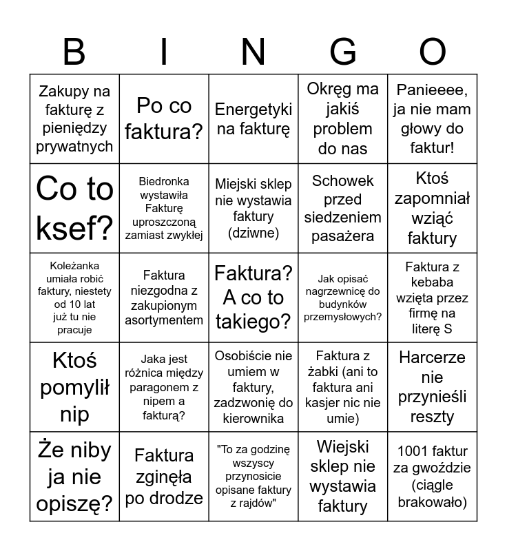 This bingo card has a free space and 24 words: Jaka jest różnica między paragonem z nipem a fakturą?, Faktura zginęła po drodze, Miejski sklep nie wystawia faktury (dziwne), Że niby ja nie opiszę?, Panieeee, ja nie mam głowy do faktur!, Zakupy na fakturę z pieniędzy prywatnych, Co to ksef?, Po co faktura?, Jak opisać nagrzewnicę do budynków przemysłowych?, Osobiście nie umiem w faktury, zadzwonię do kierownika, Schowek przed siedzeniem pasażera, Koleżanka umiała robić faktury, niestety od 10 lat już tu nie pracuje, Faktura z żabki (ani to faktura ani kasjer nic nie umie), Harcerze nie przynieśli reszty, Biedronka wystawiła Fakturę uproszczoną zamiast zwykłej, Wiejski sklep nie wystawia faktury, Faktura z kebaba wzięta przez firmę na literę S, Energetyki na fakturę, Ktoś zapomniał wziąć faktury, Faktura niezgodna z zakupionym asortymentem, 1001 faktur za gwoździe (ciągle brakowało), Ktoś pomylił nip, Okręg ma jakiś problem do nas and "To za godzinę wszyscy przynosicie opisane faktury z rajdów".
