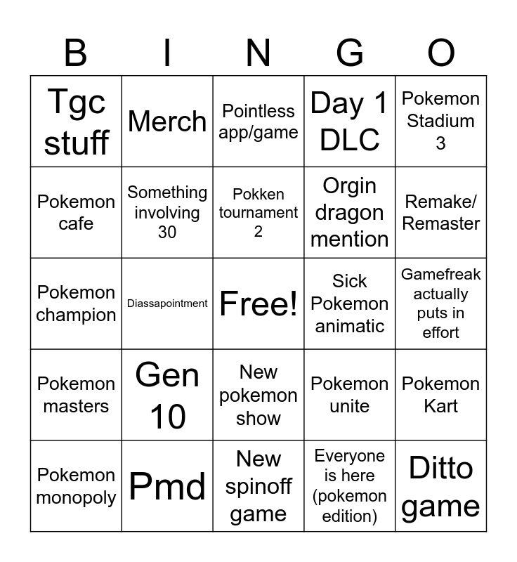 This bingo card has a free space and 24 words: Gen 10, Pmd, Pokken tournament 2, Pokemon monopoly, Pokemon Stadium 3, Tgc stuff, Pokemon cafe, Merch, Sick Pokemon animatic, New pokemon show, Orgin dragon mention, Pokemon champion, Pokemon unite, Pokemon Kart, Something involving 30, Everyone is here (pokemon edition), Gamefreak actually puts in effort, Pointless app/game, Remake/ Remaster, Diassapointment, Ditto game, Pokemon masters, Day 1 DLC and New spinoff game.