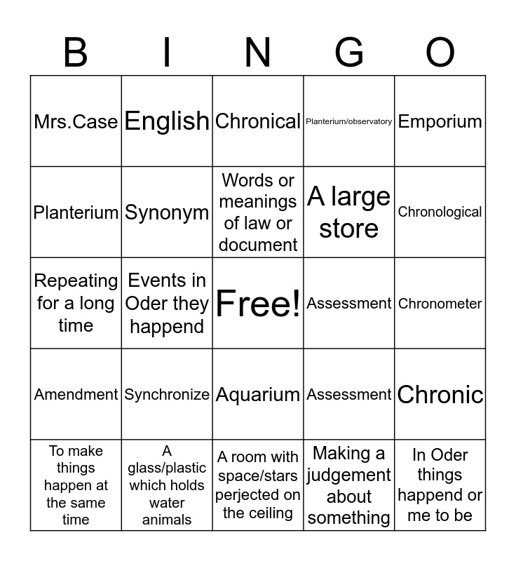 This bingo card has a free space and 24 words: Synchronize, A glass/plastic which holds water animals, Words or meanings of law or document, To make things happen at the same time, Emporium, Mrs.Case, Planterium, English, Assessment, Aquarium, A large store, Repeating for a long time, Assessment, Chronic, Synonym, Making a judgement about something, Chronometer, Chronical, Chronological, Events in Oder they happend, In Oder things happend or me to be, Amendment, Planterium/observatory and A room with space/stars perjected on the ceiling.