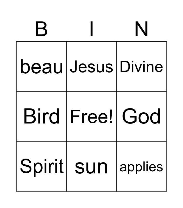 This bingo card has a free space and 8 words: Bird, Jesus, God, Spirit, Divine, beau, sun and applies.