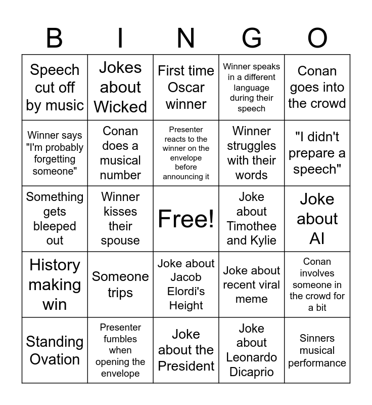 This bingo card has a free space and 33 words: Joke about Emerald Fennel/ Wuthering Heights, K-Pop Demon Hunters Bit, Winner kisses their spouse, Winner speech mentions the political climate, History making win, Conan does a musical number, Conan goes into the crowd, Standing Ovation, Jokes about Wicked, Someone cries on camera, Presenter reacts to the winner on the envelope before announcing it, First time Oscar winner, Conan does a wardrobe change, Winner shouts out someone watching at home, Joke about Timothee and Kylie, "I didn't prepare a speech", Presenter fumbles when opening the envelope, Something gets bleeped out, Someone trips, Joke about recent viral meme, Joke about Jacob Elordi's Height, Someone dresses up in a costume for a bit, Speech cut off by music, Joke about AI, Joke about the President, Sinners musical performance, Winner speaks in a different language during their speech, Winner struggles with their words, Winner says "I'm probably forgetting someone", Conan involves someone in the crowd for a bit, Montage or Tribute, Joke about Leonardo Dicaprio and Sinners wins something.