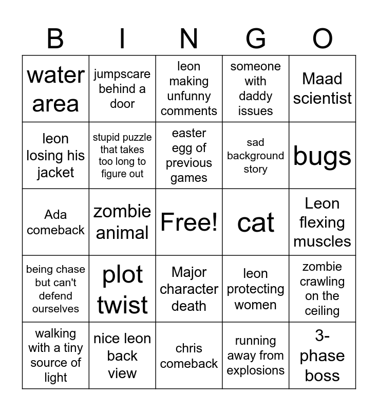 This bingo card has a free space and 24 words: plot twist, nice leon back view, easter egg of previous games, walking with a tiny source of light, Maad scientist, water area, leon losing his jacket, jumpscare behind a door, cat, Major character death, sad background story, Ada comeback, leon protecting women, zombie crawling on the ceiling, stupid puzzle that takes too long to figure out, running away from explosions, Leon flexing muscles, leon making unfunny comments, bugs, zombie animal, 3-phase boss, being chase but can't defend ourselves, someone with daddy issues and chris comeback.