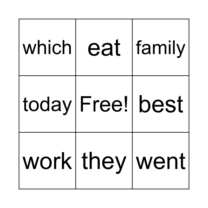 This bingo card has a free space and 8 words: best, family, eat, work, which, went, today and they.