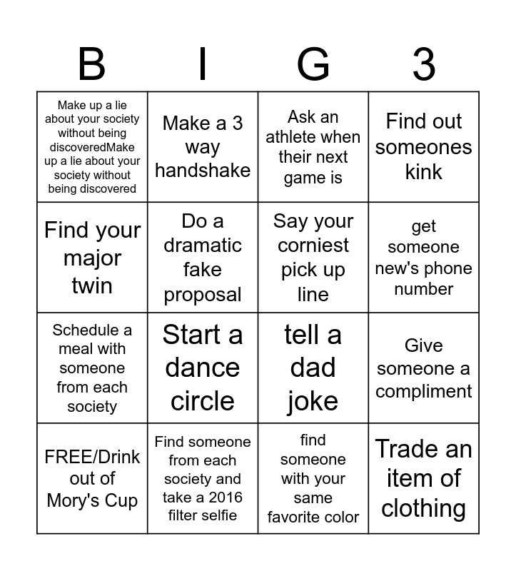 This bingo card has 16 words: Find someone from each society and take a 2016 filter selfie, Give someone a compliment, Ask an athlete when their next game is, Make up a lie about your society without being discoveredMake up a lie about your society without being discovered, Schedule a meal with someone from each society, Make a 3 way handshake, tell a dad joke, find someone with your same favorite color, Find your major twin, Do a dramatic fake proposal, FREE/Drink out of Mory's Cup, Find out someones kink, Start a dance circle, get someone new's phone number, Say your corniest pick up line and Trade an item of clothing.