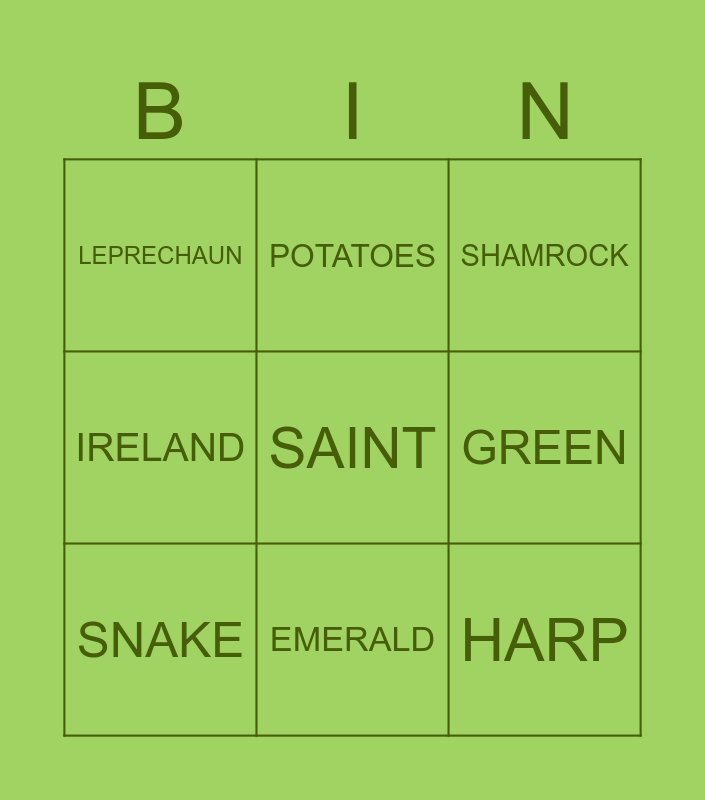 This bingo card has 16 words: POT OF GOLD, RAINBOW, SHAMROCK, LEPRECHAUN, HARP, POTATOES, COIN, PANCAKES, SAINT, GREEN, 17, IRELAND, FLAG, EMERALD, SNAKE and BOOT.