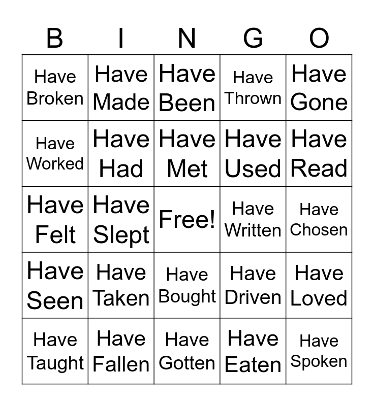 This bingo card has a free space and 34 words: Have Done, Have Eaten, Have Begun, Have Given, Have Seen, Have Had, Have Gone, Have Taught, Have Made, Have Known, Have Met, Have Been, Have Flown, Have Drunk, Have Written, Have Read, Have Fallen, Have Felt, Have Taken, Have Driven, Have Bought, Have Told, Have Broken, Have Chosen, Have Gotten, Have Spoken, Have Thrown, Have Liked, Have Used, Have Worked, Have Helped, Have Slept, Have Loved and Have Needed.