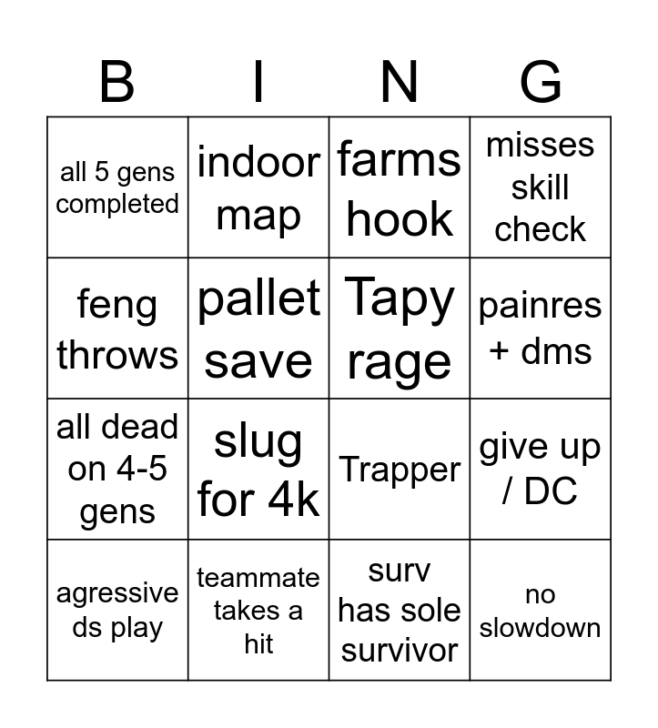This bingo card has 16 words: teammate takes a hit, give up / DC, farms hook, all 5 gens completed, all dead on 4-5 gens, indoor map, Trapper, surv has sole survivor, feng throws, pallet save, agressive ds play, misses skill check, slug for 4k, painres + dms, Tapy rage and no slowdown.