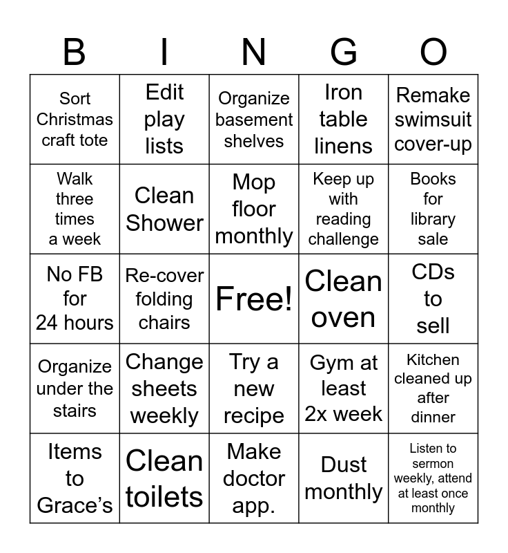 This bingo card has a free space and 24 words: Change sheets weekly, Clean toilets, Mop floor monthly, Items to Grace’s, Remake swimsuit cover-up, Sort Christmas craft tote, Walk three times a week, Edit play lists, Clean oven, Try a new recipe, Keep up with reading challenge, No FB for 24 hours, Gym at least 2x week, Kitchen cleaned up after dinner, Clean Shower, Dust monthly, CDs to sell, Organize basement shelves, Books for library sale, Re-cover folding chairs, Listen to sermon weekly, attend at least once monthly, Organize under the stairs, Iron table linens and Make doctor app..