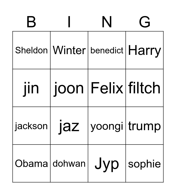 This bingo card has 16 words: dohwan, trump, benedict, Sheldon, jackson, Winter, yoongi, Jyp, jin, joon, Obama, Harry, jaz, filtch, Felix and sophie.