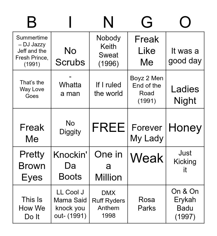 This bingo card has a free space and 39 words: Poison, Can we talk, Not gon cry, Weak, Just Kicking it, Pretty Brown Eyes, No Diggity, Pony, Forever My Lady, Honey, That’s the Way Love Goes, No Scrubs, Brown Sugar, Ladies Night, Freak Me, Knockin' Da Boots, One in a Million, Freak Like Me, You Make Me Wanna, This Is How We Do It, -Whatta a man, If I ruled the world, Rosa Parks, It was a good day, Baby got back Sir Mix-a-lot-1 (1992), LL Cool J Mama Said knock you out- (1991), DMX Ruff Ryders Anthem 1998, Gin & Juice Snoop Dogg (1993), Juvenile Back that thang up- (1999), Summertime – DJ Jazzy Jeff and the Fresh Prince, (1991), Luniz – I Got 5 On It (1995), The Notorious B.I.G. Big Poppa (1994), Boyz 2 Men End of the Road (1991), On & On Erykah Badu (1997), Let's Chil Guy (1990), Wreckx-N-Effect Rump Shaker (1992), Nobody Keith Sweat (1996), Freak Nasty "Da Dip" (1996) and Tupac ft/ Dre California Love (1996).