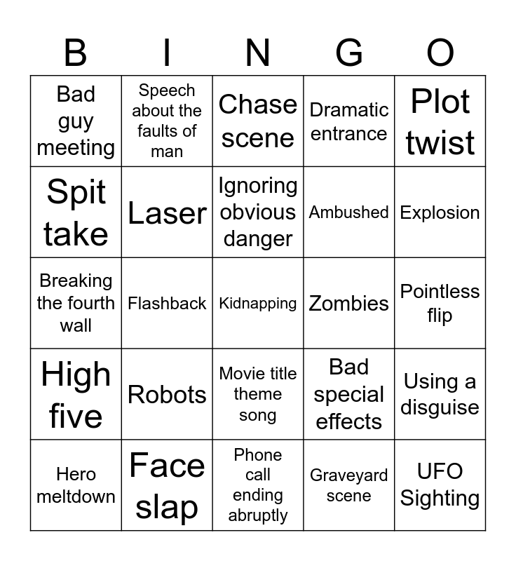 This bingo card has 26 words: Movie title theme song, Graveyard scene, Ignoring obvious danger, Face slap, Plot twist, Bad guy meeting, Spit take, Speech about the faults of man, Pointless flip, Bad special effects, Ambushed, Breaking the fourth wall, Using a disguise, Hero meltdown, Flashback, Bad pun, Dramatic entrance, High five, Chase scene, Kidnapping, Explosion, Phone call ending abruptly, Zombies, Robots, Laser and UFO Sighting.