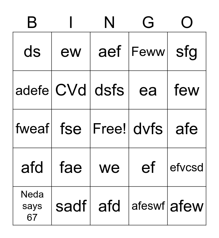 This bingo card has a free space and 29 words: Neda says 67, asdf, fse, daf, ds, aef, CVd, fae, dvfs, sadf, afe, afew, afd, afeswf, few, fawea, we, afd, sfg, fweaf, ef, ae, ea, adefe, Feww, ew, efvcsd, dsfs and df.