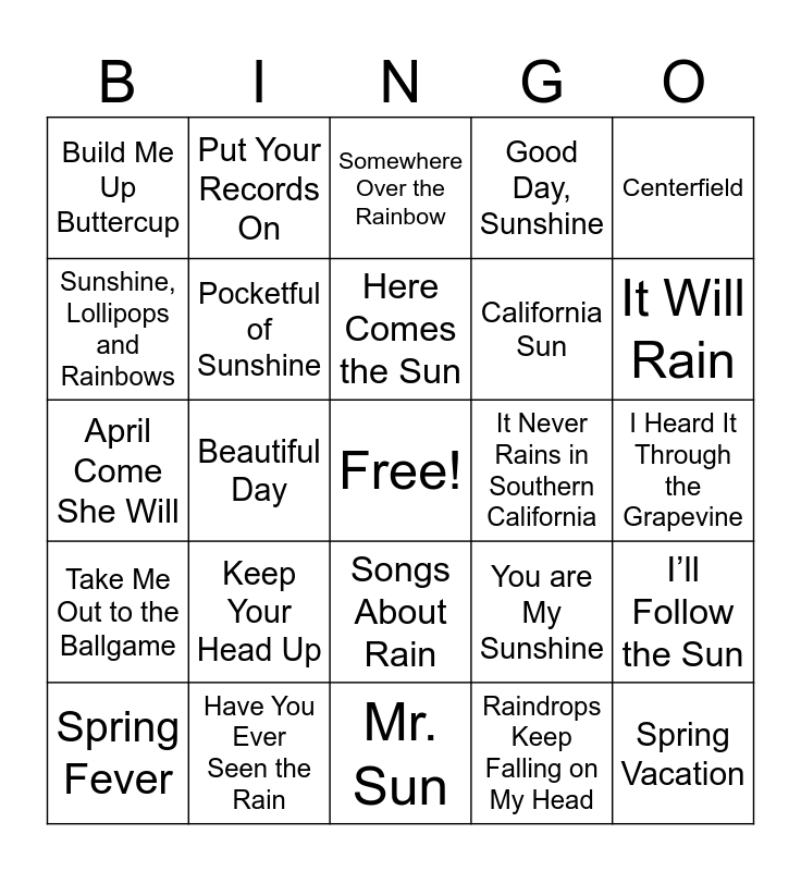 This bingo card has a free space and 36 words: Mr. Blue Sky, Southland in the Springtime, Umbrella, Pocketful of Sunshine, You are My Sunshine, Take Me Out to the Ballgame, Here Comes the Sun, Singin' In the Rain, Centerfield, I can See Clearly Now, Beautiful Day, Good Day, Sunshine, I Wish it would Rain, It Never Rains in Southern California, It Will Rain, Build Me Up Buttercup, Walking on Sunshine, Keep Your Head Up, Spring Vacation, Somewhere Over the Rainbow, I Heard It Through the Grapevine, I’ll Follow the Sun, Have You Ever Seen the Rain, Spring Fever, Mr. Sun, Put Your Records On, April Come She Will, Soak Up the Sun, California Sun, Sunshine, Lollipops and Rainbows, Keep on the Sunnyside, I Love a Rainy Night, Raindrops Keep Falling on My Head, Songs About Rain, I’m No Stranger to the Rain and Kentucky Rain.