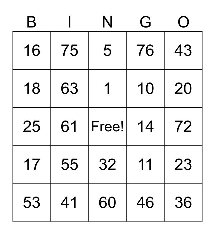 This bingo card has a free space and 24 words: 55, 41, 1, 53, 43, 16, 18, 75, 14, 32, 10, 25, 11, 23, 63, 46, 72, 5, 20, 61, 36, 17, 76 and 60.