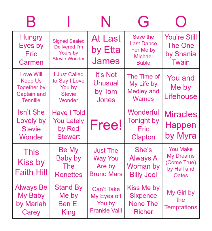 This bingo card has a free space and 49 words: This Will Be by Natalie Cole, My Girl by the Temptations, Best of My Love by The Emotions, Can’t Take My Eyes off You by Frankie Valli, Be My Baby by The Ronettes, The Way You Look Tonight by Frank Sinatra, Signed Sealed Delivered I’m Yours by Stevie Wonder, L-O-V-E by Nat King Cole, Love Will Keep Us Together by Captain and Tennille, How Sweet It Is by James Taylor, I Just Called to Say I Love You by Stevie Wonder, Save the Last Dance For Me by Michael Buble, You Make My Dreams (Come True) by Hall and Oates, She’s Always A Woman by Billy Joel, Emotions by Mariah Carey, Easy by Commodores, It’s Not Unusual by Tom Jones, Wonderful Tonight by Eric Clapton, Can You Feel The Love Tonight by Elton John, You’re Still The One by Shania Twain, Have I Told You Lately by Rod Stewart, Kiss Me by Sixpence None The Richer, Hungry Eyes by Eric Carmen, The Time of My Life by Medley and Warnes, No One by Alicia Keys, You and Me by Lifehouse, Always Be My Baby by Mariah Carey, If I Ain’t Got You by Alicia Keys, Just The Way You Are by Bruno Mars, This Kiss by Faith Hill, Marry You by Bruno Mars, As Long As You Love Me by Backstreet Boys, Ain’t No Other Man by Christina Aguilara, Fallin’ For You by Colbie Callait, Stand By Me by Ben E. King, Beautiful Soul by Jesse McCartney, Collide by Howie Day, Where You Lead by Carole King, Miracles Happen by Myra, With You by Jessica Simpson, It Had To Be You by Harry Connick Jr, Happy Together by The Turtles, Only Wanna Be With You by Hootie and the Blowfish, A Thousand Miles by Vanessa Carlton, Isn’t She Lovely by Stevie Wonder, At Last by Etta James, She Will Be Loved by Maroon 5, I Will Always Love You by Whitney Houston and The Way You Make Me Feel by Michael Jackson.