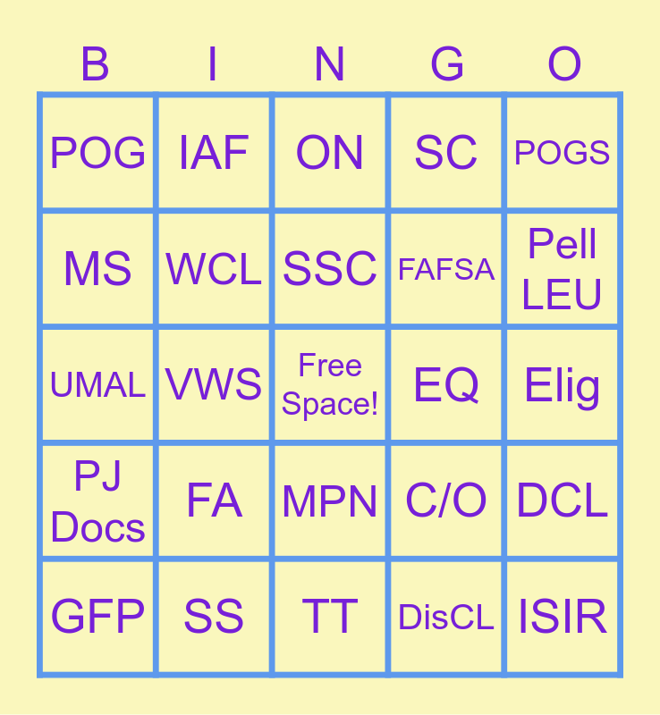This bingo card has a free space and 24 words: FA, SS, SSC, GFP, POGS, POG, MS, IAF, EQ, MPN, FAFSA, UMAL, C/O, DCL, WCL, DisCL, Elig, ON, Pell LEU, VWS, ISIR, PJ Docs, SC and TT.