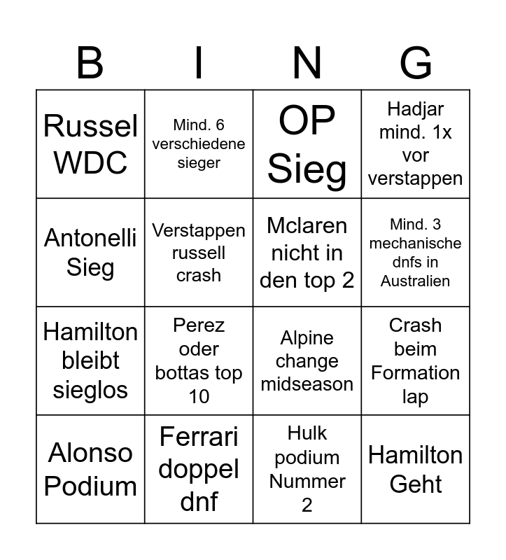 This bingo card has 16 words: Alonso Podium, Ferrari doppel dnf, OP Sieg, Hadjar mind. 1x vor verstappen, Antonelli Sieg, Mind. 6 verschiedene sieger, Alpine change midseason, Crash beim Formation lap, Russel WDC, Verstappen russell crash, Hulk podium Nummer 2, Mind. 3 mechanische dnfs in Australien, Hamilton bleibt sieglos, Perez oder bottas top 10, Mclaren nicht in den top 2 and Hamilton Geht.