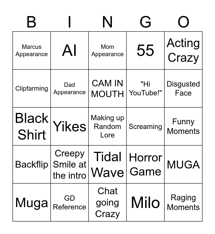 This bingo card has a free space and 29 words: Muga, Raps, Yikes, Vortrox, Marcus Appearance, Mom Appearance, Dad Appearance, Creepy Smile at the intro, Screaming, GD Reference, Funny Moments, Raging Moments, Chat going Crazy, Milo, Disgusted Face, Discord, Tidal Wave, Backflip, Acting Crazy, Black Shirt, Horror Game, Goofy Ahh Meme, "Hi YouTube!", Clipfarming, 55, AI, MUGA, CAM IN MOUTH and Piano.