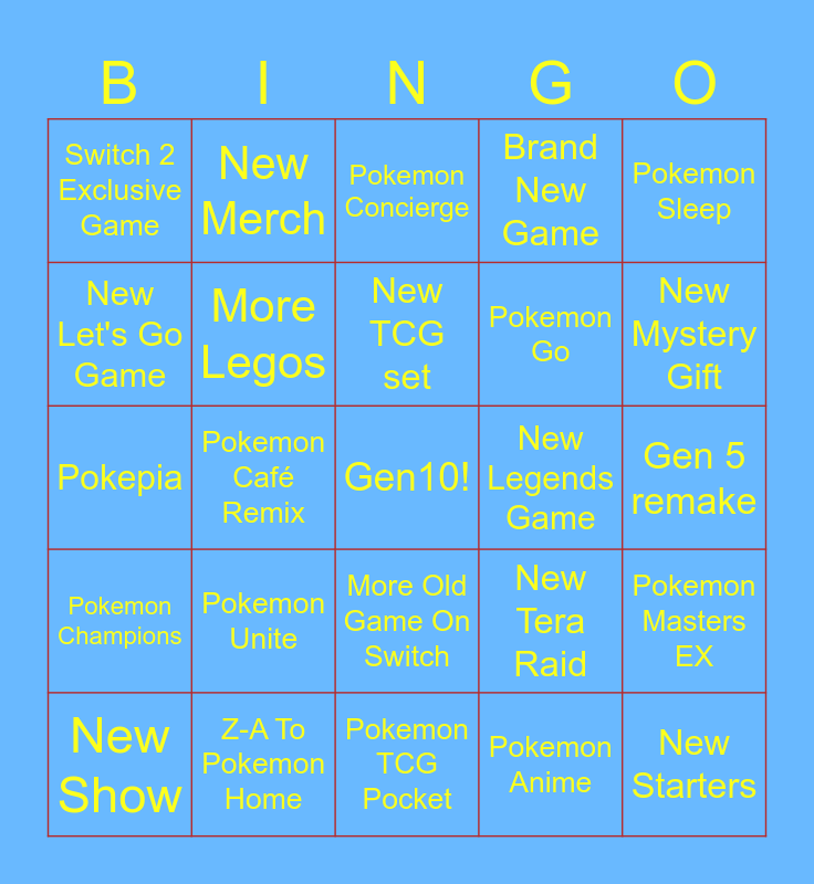 This bingo card has a free space and 24 words: Pokemon Unite, Z-A To Pokemon Home, New TCG set, New Show, Pokemon Sleep, Switch 2 Exclusive Game, New Let's Go Game, New Merch, New Legends Game, More Old Game On Switch, Pokemon Go, Pokepia, New Tera Raid, Pokemon Masters EX, More Legos, Pokemon Anime, Gen 5 remake, Pokemon Concierge, New Mystery Gift, Pokemon Café Remix, New Starters, Pokemon Champions, Brand New Game and Pokemon TCG Pocket.