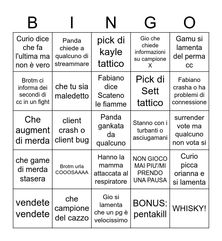 This bingo card has 25 words: Brotm urla COOOSAAAA, Gio si lamenta che un pg è velocissimo, Fabiano dice Scateno le fiamme, vendete vendete, Gamu si lamenta del perma cc, Curio dice che fa l'ultima ma non è vero, Brotm ci informa dei secondi di cc in un fight, Panda chiede a qualcuno di streammare, Stanno con i turbanti o asciugamani, Hanno la mamma attaccata al respiratore, Pick di Sett tattico, Che augment di merda, NON GIOCO MAI PIU'/MI PRENDO UNA PAUSA, Curio picca orianna e si lamenta, che tu sia maledetto, WHISKY!, surrender vote ma qualcuno non vota si, pick di kayle tattico, Fabiano crasha o ha problemi di connessione, client crash o client bug, Panda gankata da qualcuno, che campione del cazzo, che game di merda stasera, Gio che chiede informazioni su campione X and BONUS: pentakill.