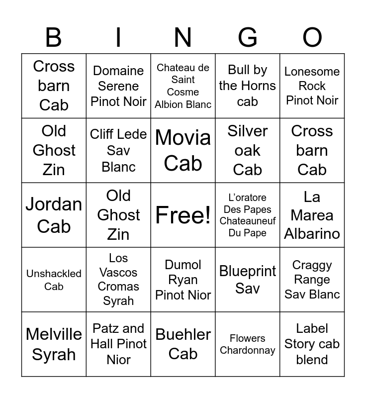 This bingo card has a free space and 24 words: Los Vascos Cromas Syrah, Patz and Hall Pinot Nior, Movia Cab, Melville Syrah, Lonesome Rock Pinot Noir, Cross barn Cab, Old Ghost Zin, Domaine Serene Pinot Noir, L’oratore Des Papes Chateauneuf Du Pape, Dumol Ryan Pinot Nior, Silver oak Cab, Jordan Cab, Blueprint Sav, Craggy Range Sav Blanc, Cliff Lede Sav Blanc, Flowers Chardonnay, La Marea Albarino, Chateau de Saint Cosme Albion Blanc, Cross barn Cab, Old Ghost Zin, Label Story cab blend, Unshackled Cab, Bull by the Horns cab and Buehler Cab.