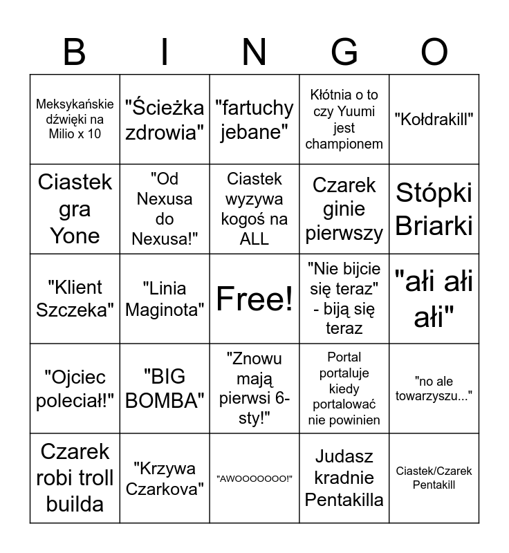 This bingo card has a free space and 30 words: "Krzywa Czarkova", "Rozgrzewkoooowa", "Linia Maginota", "MR PRESIDENT GET DOWN!", Meksykańskie dźwięki na Milio x 10, "fartuchy jebane", "Od Nexusa do Nexusa!", "Znowu mają pierwsi 6-sty!", "Nie bijcie się teraz" - biją się teraz, "AWOOOOOOO!", "ałi ałi ałi", Ciastek/Czarek Pentakill, Judasz kradnie Pentakilla, "Shacko w Krzako", Stópki Briarki, "Czerwona wygrana", Portal portaluje kiedy portalować nie powinien, "Ojciec poleciał!", "BIG BOMBA", "Kołdrakill", "Klient Szczeka", Judasz gra Żabą/Pantheonem/ Dariusem, "Ścieżka zdrowia", Czarek ginie pierwszy, Ciastek gra Yone, Kłótnia o to czy Yuumi jest championem, "no ale towarzyszu...", Czarek robi troll builda, Ciastek wyzywa kogoś na ALL and Wera broni wieży/inhibitora (stresując się).