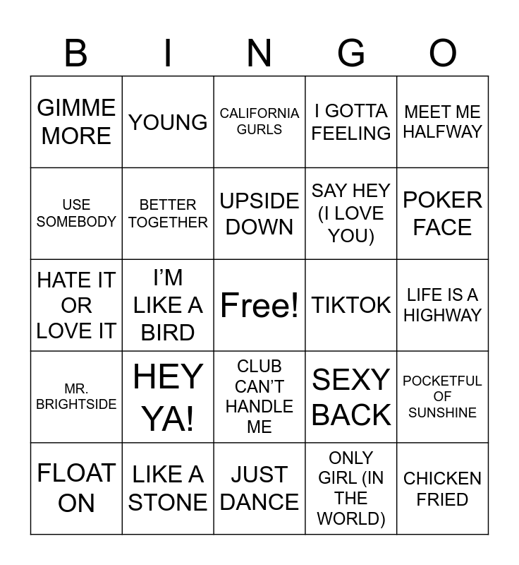 This bingo card has a free space and 24 words: HEY YA!, LIKE A STONE, UPSIDE DOWN, FLOAT ON, MEET ME HALFWAY, GIMME MORE, USE SOMEBODY, YOUNG, TIKTOK, CLUB CAN’T HANDLE ME, SAY HEY (I LOVE YOU), HATE IT OR LOVE IT, SEXY BACK, POCKETFUL OF SUNSHINE, BETTER TOGETHER, ONLY GIRL (IN THE WORLD), LIFE IS A HIGHWAY, CALIFORNIA GURLS, POKER FACE, I’M LIKE A BIRD, CHICKEN FRIED, MR. BRIGHTSIDE, I GOTTA FEELING and JUST DANCE.