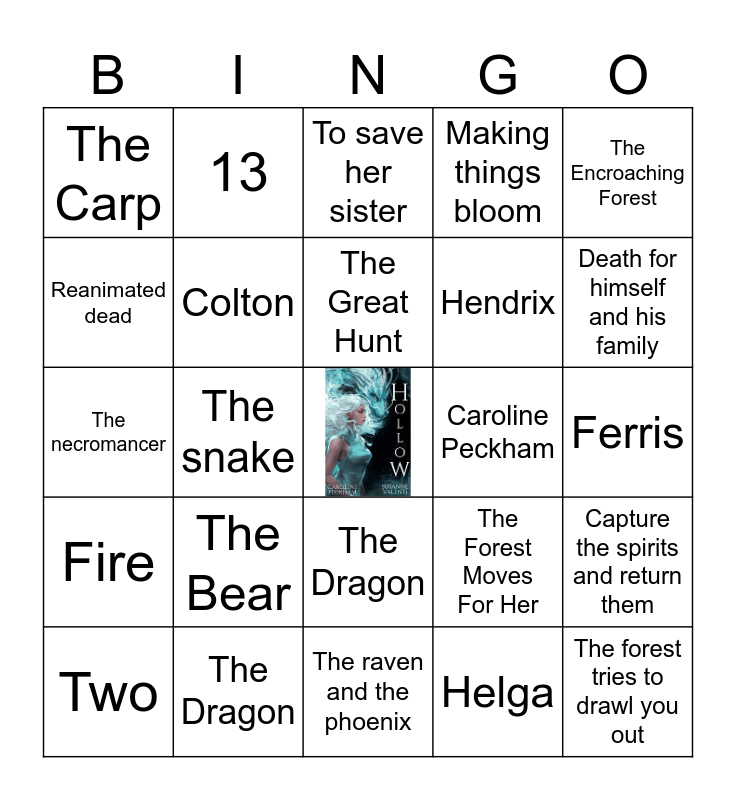 This bingo card has a free space and 24 words: The Bear, The Dragon, The Great Hunt, Two, The Encroaching Forest, The Carp, Reanimated dead, 13, Caroline Peckham, The Dragon, Hendrix, The necromancer, The Forest Moves For Her, Capture the spirits and return them, Colton, Helga, Ferris, To save her sister, Death for himself and his family, The snake, The forest tries to drawl you out, Fire, Making things bloom and The raven and the phoenix.