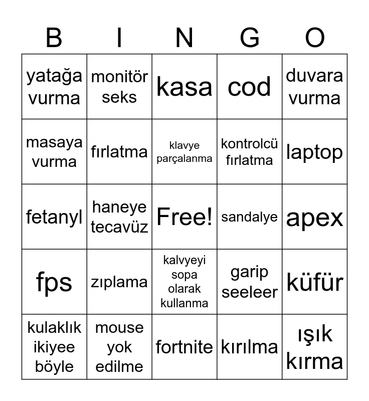 This bingo card has a free space and 24 words: zıplama, mouse yok edilme, klavye parçalanma, kulaklık ikiyee böyle, duvara vurma, yatağa vurma, masaya vurma, monitör seks, sandalye, kalvyeyi sopa olarak kullanma, kontrolcü fırlatma, fetanyl, garip seeleer, küfür, fırlatma, kırılma, apex, kasa, laptop, haneye tecavüz, ışık kırma, fps, cod and fortnite.