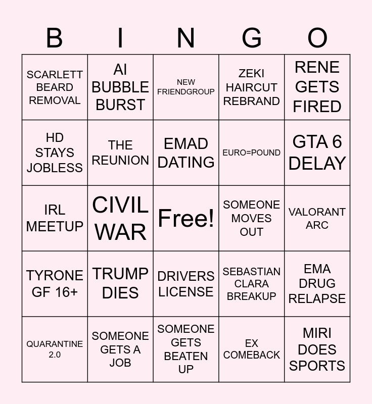 This bingo card has a free space and 24 words: TRUMP DIES, SOMEONE GETS A JOB, EMAD DATING, QUARANTINE 2.0, RENE GETS FIRED, SCARLETT BEARD REMOVAL, HD STAYS JOBLESS, AI BUBBLE BURST, SOMEONE MOVES OUT, DRIVERS LICENSE, EURO=POUND, IRL MEETUP, SEBASTIAN CLARA BREAKUP, EMA DRUG RELAPSE, THE REUNION, EX COMEBACK, VALORANT ARC, NEW FRIENDGROUP, GTA 6 DELAY, CIVIL WAR, MIRI DOES SPORTS, TYRONE GF 16+, ZEKI HAIRCUT REBRAND and SOMEONE GETS BEATEN UP.