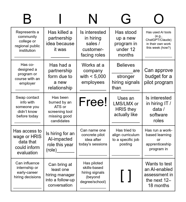 This bingo card has a free space and 25 words: Is hiring for an AI-impacted role this year (role)_______, Has piloted skills-based hiring signals (beyond degree/school) ____________, Works at a company with < 5,000 employees __________, Can influence internship or early-career hiring decisions _____________, Has used AI tools (e.g., ChatGPT/Claude) in their own work this week (how?) _______________, Represents a community college or regional public institution ____________, Has co-designed a program or course with an employer ___________, Has killed a partnership idea because it was _______, Uses an LMS/LMX or HRIS they actually like ___________, Can name one concrete pilot idea after today’s sessions _____________, Believes ________are stronger hiring signals than_______, Swap contact info with someone you didn’t know before today ____________, Has tried to align curriculum to a specific job posting _____________, Has run a work-based learning or apprenticeship program in _____________, Has had a partnership form due to a new relationship, Is interested in hiring operations / supply chain roles, Is interested in hiring IT / data / software roles, Is interested in hiring sales / customer-facing roles, Can approve budget for a pilot program, Has been burned by an ATS or screening tool missing good candidates, Wants to test an AI-enabled assessment in the next 12–18 months, Can bring at least one hiring manager into a follow-up conversation, Has access to wage or HRIS data that could inform evaluation, Has stood up a new program in under 12 months and [ ].