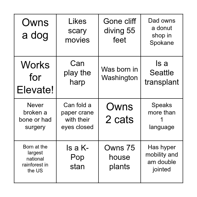 This bingo card has 16 words: Is a K-Pop stan, Speaks more than 1 language, Gone cliff diving 55 feet, Owns a dog, Never broken a bone or had surgery, Likes scary movies, Owns 2 cats, Owns 75 house plants, Works for Elevate!, Can play the harp, Born at the largest national rainforest in the US, Dad owns a donut shop in Spokane, Can fold a paper crane with their eyes closed, Is a Seattle transplant, Was born in Washington and Has hyper mobility and am double jointed.