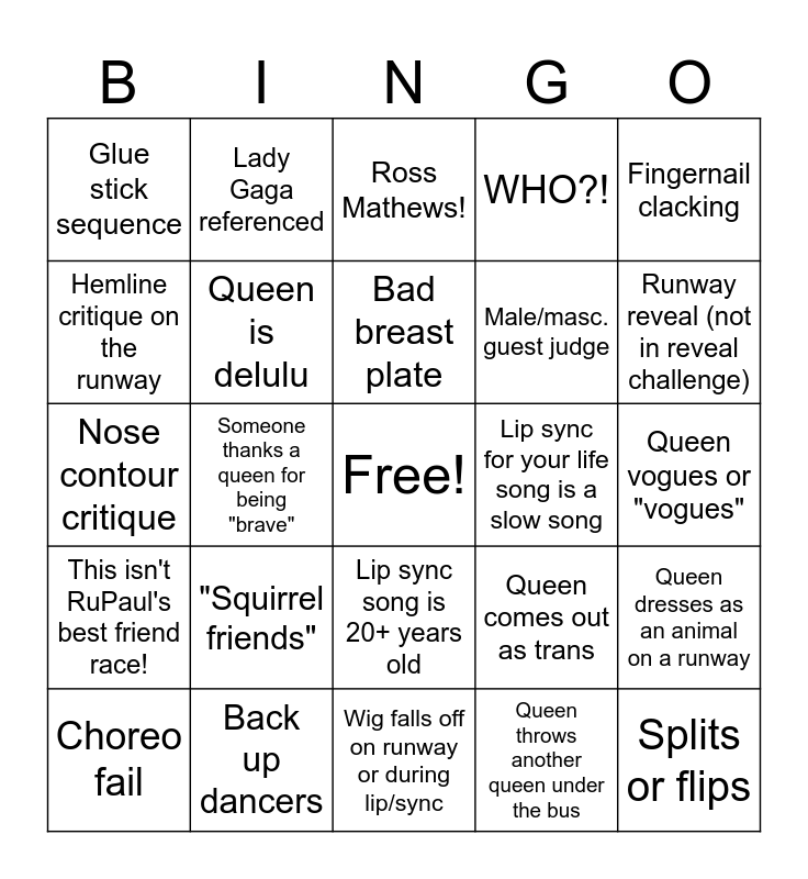 This bingo card has a free space and 24 words: "Squirrel friends", Back up dancers, Bad breast plate, Choreo fail, Fingernail clacking, Glue stick sequence, Hemline critique on the runway, Lady Gaga referenced, Lip sync for your life song is a slow song, Lip sync song is 20+ years old, Male/masc. guest judge, Nose contour critique, Queen comes out as trans, Queen dresses as an animal on a runway, Queen is delulu, Queen throws another queen under the bus, Queen vogues or "vogues", Ross Mathews!, Runway reveal (not in reveal challenge), Someone thanks a queen for being "brave", Splits or flips, This isn't RuPaul's best friend race!, WHO?! and Wig falls off on runway or during lip/sync.
