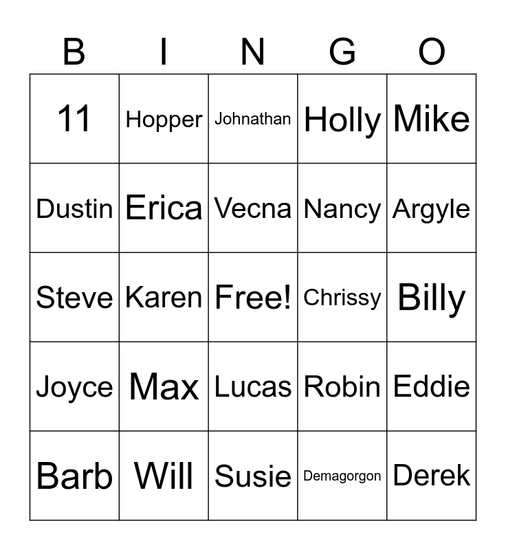 This bingo card has a free space and 24 words: Max, Will, Vecna, Barb, Mike, 11, Dustin, Hopper, Chrissy, Lucas, Nancy, Steve, Robin, Eddie, Erica, Demagorgon, Billy, Johnathan, Argyle, Karen, Derek, Joyce, Holly and Susie.