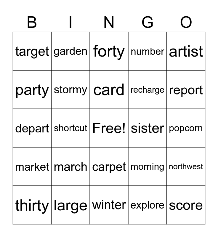 This bingo card has a free space and 24 words: march, large, card, thirty, artist, target, party, garden, sister, carpet, recharge, depart, morning, northwest, stormy, explore, popcorn, forty, report, shortcut, score, market, number and winter.