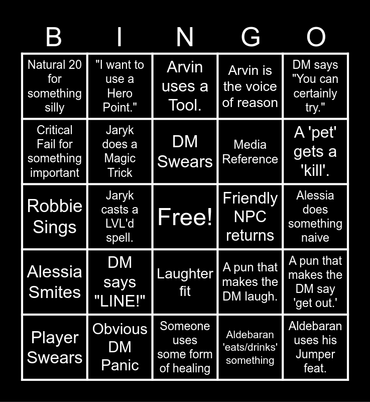This bingo card has a free space and 24 words: DM says "LINE!", Obvious DM Panic, DM Swears, Player Swears, DM says "You can certainly try.", Natural 20 for something silly, Critical Fail for something important, "I want to use a Hero Point.", Friendly NPC returns, Laughter fit, Media Reference, Robbie Sings, A pun that makes the DM laugh., A pun that makes the DM say 'get out.', Jaryk does a Magic Trick, Aldebaran 'eats/drinks' something, Alessia does something naive, Arvin uses a Tool., A 'pet' gets a 'kill'., Jaryk casts a LVL'd spell., Aldebaran uses his Jumper feat., Alessia Smites, Arvin is the voice of reason and Someone uses some form of healing.