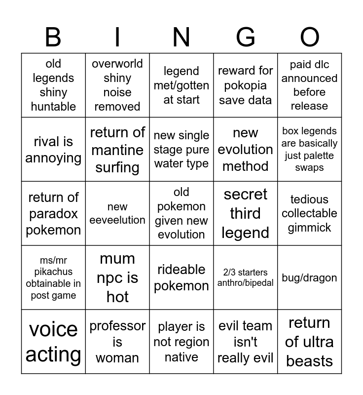 This bingo card has 25 words: mum npc is hot, player is not region native, new single stage pure water type, voice acting, paid dlc announced before release, old legends shiny huntable, rival is annoying, overworld shiny noise removed, secret third legend, rideable pokemon, new evolution method, return of paradox pokemon, 2/3 starters anthro/bipedal, bug/dragon, return of mantine surfing, return of ultra beasts, tedious collectable gimmick, legend met/gotten at start, box legends are basically just palette swaps, new eeveelution, old pokemon given new evolution, professor is woman, ms/mr pikachus obtainable in post game, reward for pokopia save data and evil team isn't really evil.