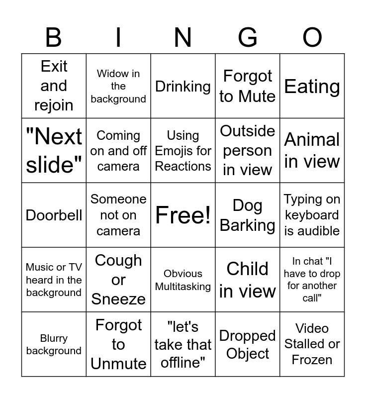 This bingo card has a free space and 24 words: Cough or Sneeze, Forgot to Unmute, Using Emojis for Reactions, Blurry background, Eating, Exit and rejoin, "Next slide", Widow in the background, Dog Barking, Obvious Multitasking, Outside person in view, Doorbell, Child in view, In chat "I have to drop for another call", Coming on and off camera, Dropped Object, Typing on keyboard is audible, Drinking, Animal in view, Someone not on camera, Video Stalled or Frozen, Music or TV heard in the background, Forgot to Mute and "let's take that offline".