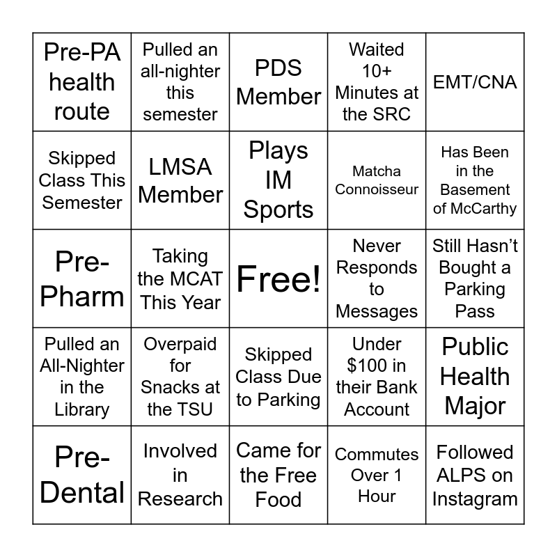 This bingo card has a free space and 49 words: Pre-Med health route, Loves Coffee, Volunteered at a Hospital, Commutes Over 1 Hour, Still Hasn’t Bought a Parking Pass, Is an NSM Major, Pulled an all-nighter this semester, Has shadowed a physician, Matcha Connoisseur, Has a Disney Pass, Skipped Class This Semester, Taking the MCAT This Year, Under $100 in their Bank Account, Followed ALPS on Instagram, Works at a Clinic/Hospital, Changed Majors at Least Once, PDS Member, Never Responds to Messages, Had No Breakfast Today, Pre-PA health route, Involved in Research, Came for the Free Food, Waited 10+ Minutes at the SRC, EMT/CNA, Pre-Nursing, Overpaid for Snacks at the TSU, Plays IM Sports, Has a Leadership Position in a Club, Public Health Major, Pulled an All-Nighter in the Library, ALCSI Member, Skipped Class Due to Parking, Planning to Take a Gap Year, Got Caught Using ChatGPT, Pre-Dental, Has Presented a Research Poster, Never Been to the Arboretum, SHPA Member, Has Been in the Basement of McCarthy, Pre-PT, Had Roll & Grill 2+ Times in One Week, Runs a Marathon, PACT Member, Kinesiology Major, Pre-Pharm, LMSA Member, Accidentally Liked an Old Instagram Photo, ALPS Director and KSA Member.