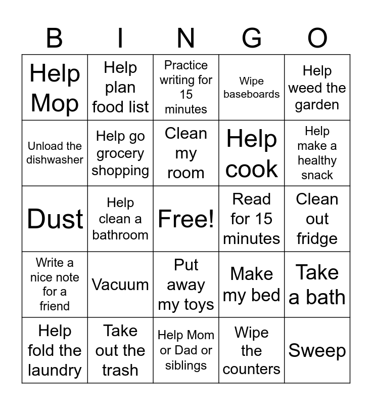This bingo card has a free space and 24 words: Vacuum, Take out the trash, Clean my room, Help fold the laundry, Help weed the garden, Help Mop, Unload the dishwasher, Help plan food list, Read for 15 minutes, Put away my toys, Help cook, Dust, Make my bed, Take a bath, Help go grocery shopping, Wipe the counters, Clean out fridge, Practice writing for 15 minutes, Help make a healthy snack, Help clean a bathroom, Sweep, Write a nice note for a friend, Wipe baseboards and Help Mom or Dad or siblings.
